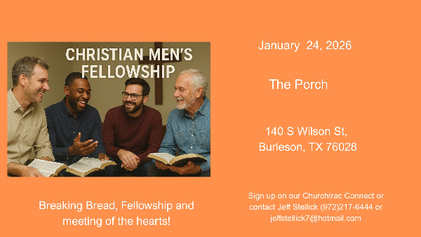 Men's Breakfast at The Porch, 140 S Wilson St, Burleson, TX 76028.Come break bread, fellowship and meeting of the hearts.